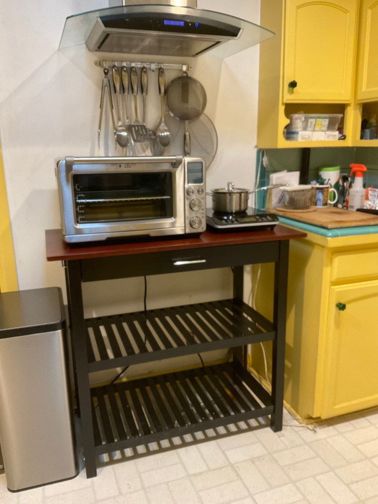 But it’s no bigger than a microwave oven and fits beautifully on the inexpensive wood table we got for it and the induction burner that now sit side by side under the exhaust hood.